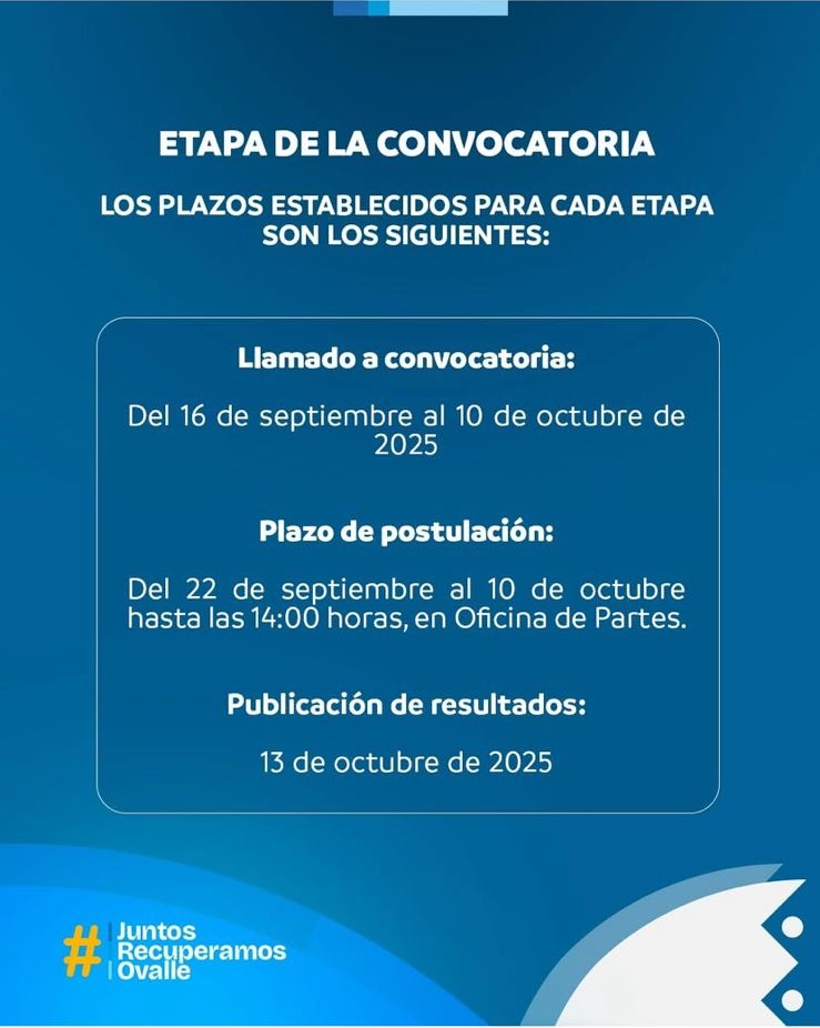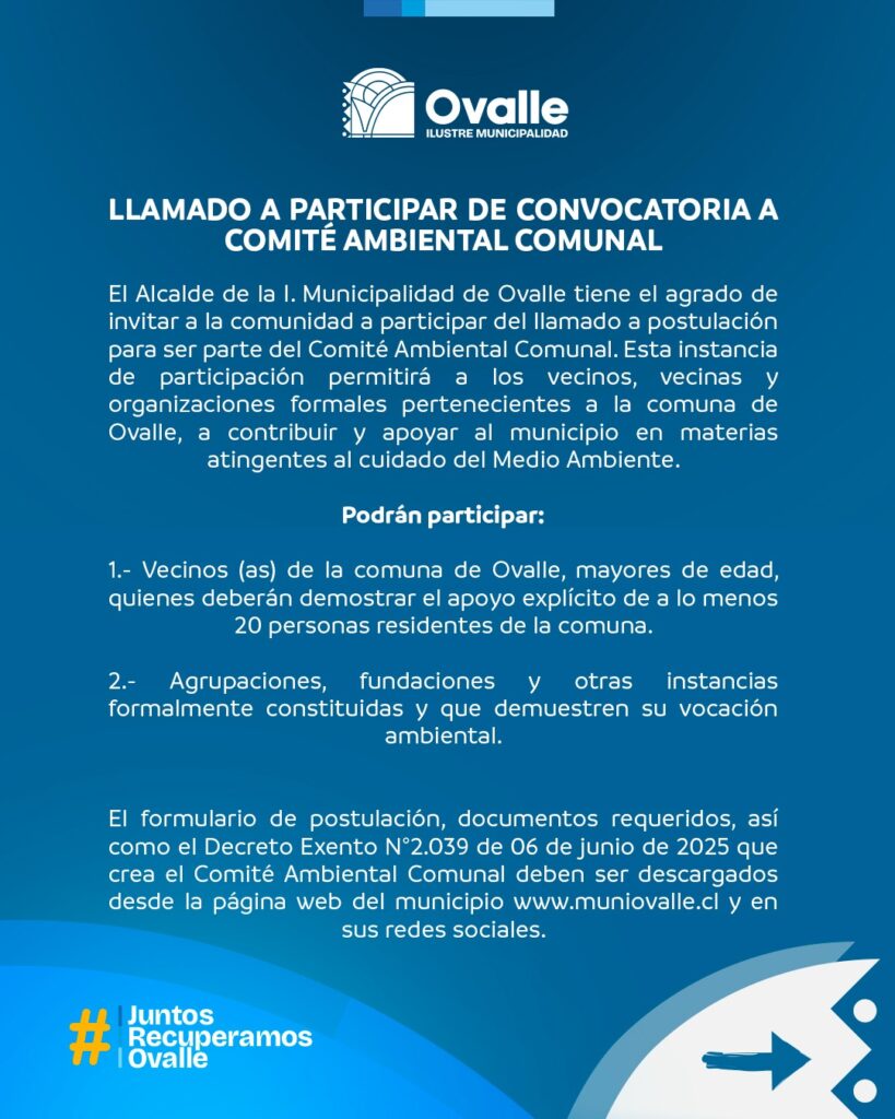 El Alcalde de la I. Municipalidad de Ovalle tiene el agrado de invitar a la comunidad a participar del llamado a postulación para ser parte Comité Ambiental Comunal. Esta instancia de participaciín permitirá a los vecinos, vecinas y organizaciones formales pertenecientes a la comuna de Ovalle, a contribuir y apoyar al municipio en materias atingentes al cuidado del Medio Ambiente.